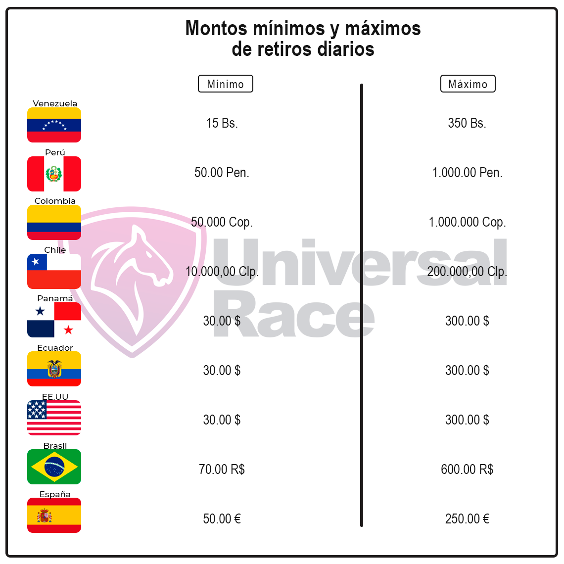 - El saldo será acreditado en la cuenta del usuario en universalrace.net según el valor de la moneda del día en el que se realiza la operación en que este registrado (se hace la conversión al cambio de dólar a su moneda local según la tasa del día, tomando como referencia la App XE para el valor diario).
